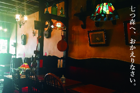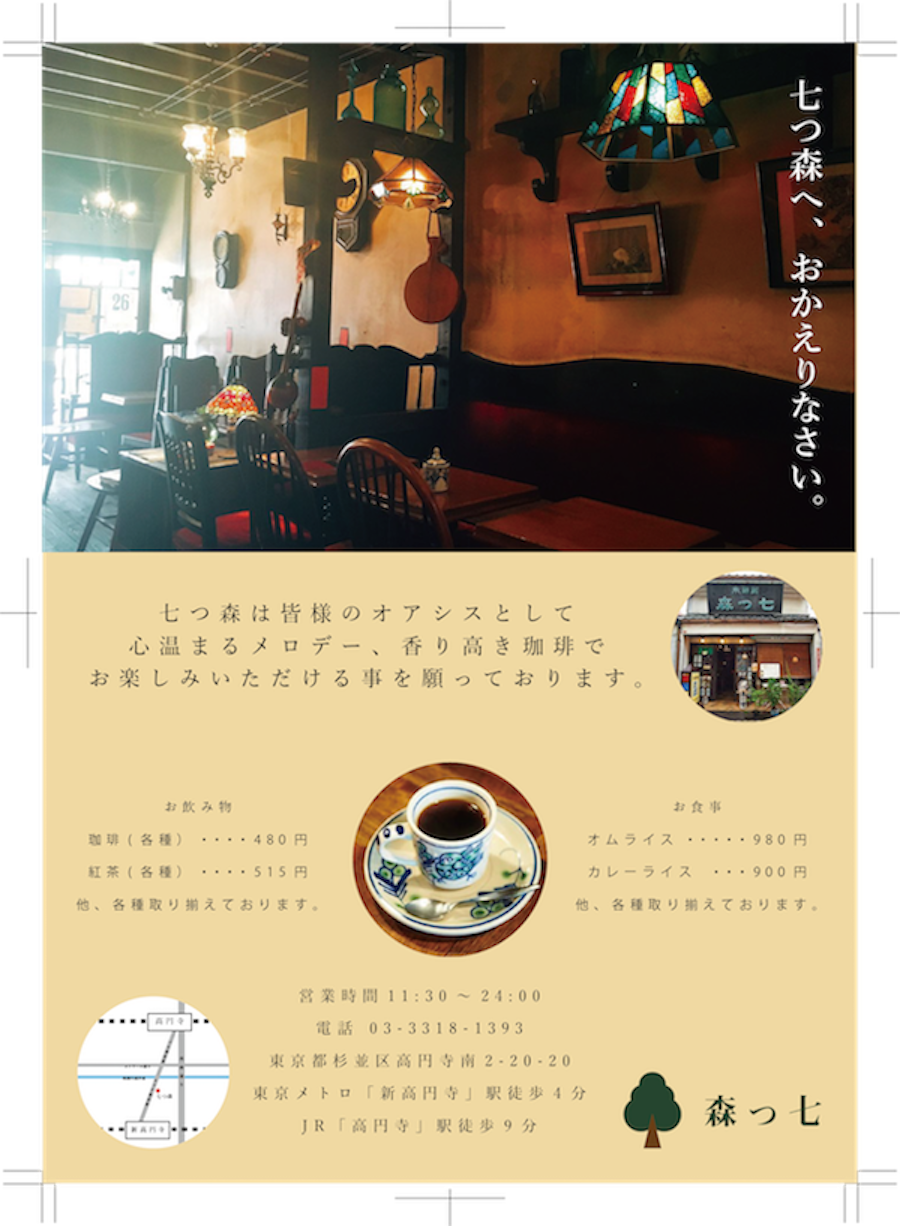 実在の喫茶店「七つ森」に足を運んで写真を撮り、チラシを作成。 -